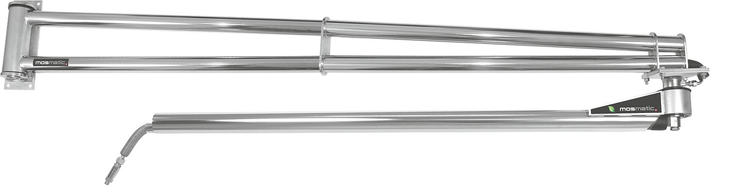 Wenn größere Längen und maximale Flexibilität gefragt sind, kommt der robuste Wandschwenkausleger zum Einsatz, wie z. B. bei den LKW-Waschanlagen. Dieser Ausleger verfügt über ein Innenrohr. Der Deckenkreisel ist nicht im Lieferumfang enthalten. Passend zu diesem Ausleger ist der DKP Deckenkreisel von Mosmatic.