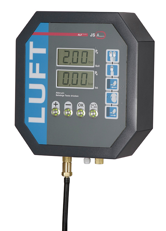 - Anzeige des Soll- und Ist-Druckes auf zwei gut ablesbaren LCD-Displays mit 30 mm Ziffernhöhe und Hintergrundbeleuchtung